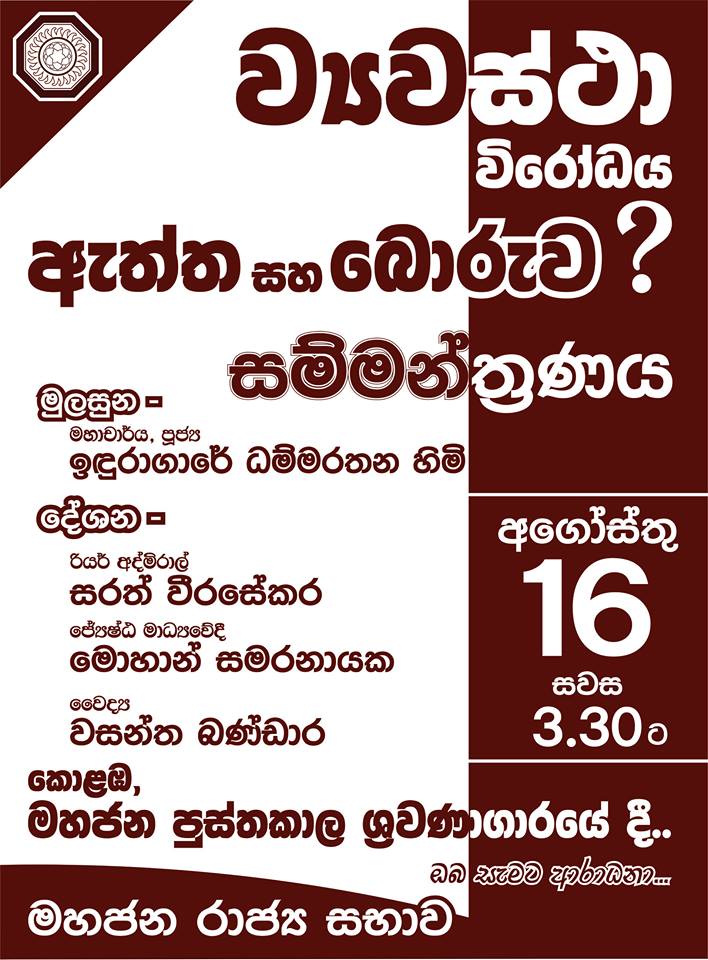 මහජන රාජ්ය සභාව විසින් පවත්වන ‘‘ව්යවස්ථා විරෝධය ඇත්ත සහ බොරුව’’ විශේෂ සම්මන්ත්රණය අගෝස්තු 16 සවස 3:00ට මහජන පුස්තකාල ශ්රවණාගාරයේදී පැවැත්වීමට නියමිතය.