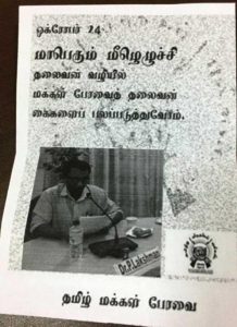 අදාළ පත්රිකාවේ දෙමළ ජනතා සභාවේ සමසභාපති වරයෙකු වන වෛද්ය පී. ලක්ෂ්මන් මහතාගේ ඡායාරූපයක්ද සමග සඳහන් කොට ඇත්තේ ‘නායකයන්ගේ මාසයේ මහා නැගිටීම, දෙමළ ජනතා පෙරමුණේ නායකයන්ගේ දෑත් ශක්තිමත් කිරීමට එක්වන ලෙසය.
