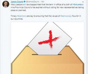 ශ්රී ලංකාවේ පළාත් සභා හයකම නිල කාලය අවසන්ව ඇතැත් එහි සාමාජිකයන් අලුතෙන් පත් කර ගැනීම සඳහා මැතිවරණ නොපැවැත්වීම හේතුවෙන් බොහෝ පුද්ගලයින් කනගාටුවෙනු ඇතැයි ශ්රී ලංකාවේ බිතාන්ය මහ කොමසාරිස් ජේම්ස් ඩවුරිස් මහත පවසයි.