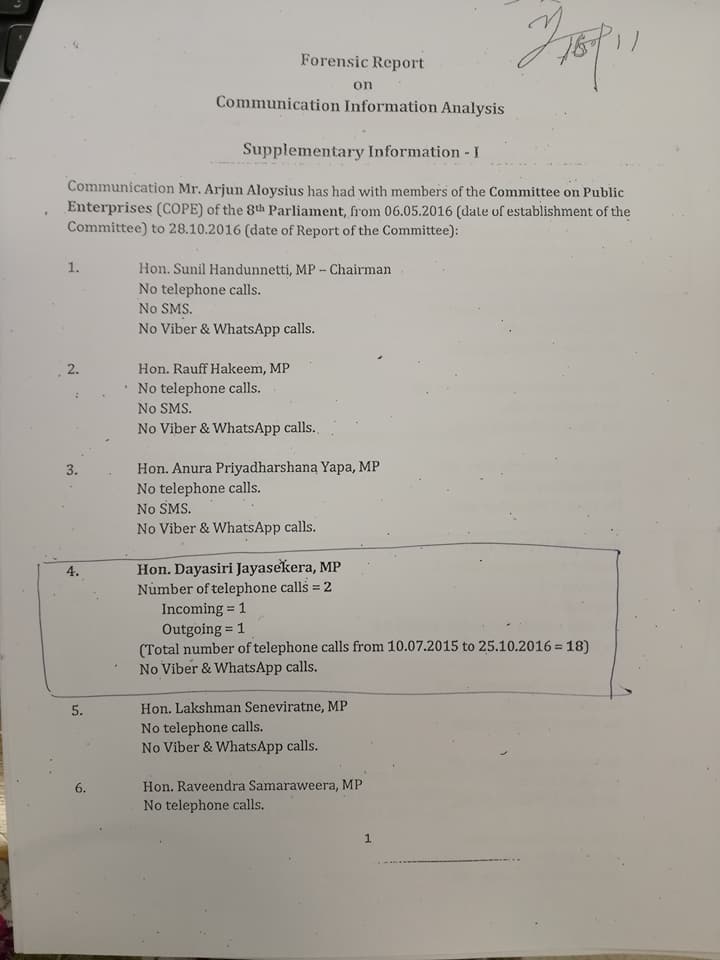 මෙම වාර්තාව අනුව කෝප් කමිටුවේ පරීක්ෂණ සිදුවූ 2016.05.06 දින සිට 2016.10.28 කාලය අතරතුර අමාත්ය දයාසිරි ජයසේකර මහතාට ඇලෝසියස් මහතා එක් දුරකථන ඇමතුමක් ලබා දී ඇති අතර දයාසිරි ජයසේකර මහතා ඇලෝසියස් මහතාට එක් දුරකථන ඇමතුමක් ලබාදී තිබේ. එමෙන්ම 2015.07.10 සිට 2016.10.25 අතර කාලය තුළ දුරකථන ඇමතුම් 18ක් හුවමාරු වී තිබේ.