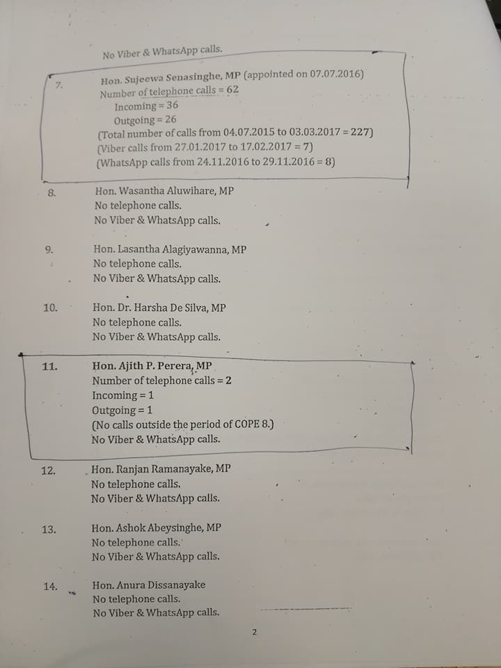 එම වාර්තාව අනුව කෝප් සභාපති ජවිපෙ මන්ත්රී සුනිල් හඳුන්නෙත්ති, විපක්ෂයේ ප්රධාන සංවිධායක, ජවිපෙ නායක අනුර දිසානායක, මන්ත්රී බිමල් රත්නායක, මන්ත්රී වෛද්ය නලින්ද ජයතිස්ස, අමාත්ය රවූෆ් හකීම්, අමත්ය අනුර ප්රියදර්ශන යාපා, මන්ත්රී ලක්ෂ්මන් සෙනෙවිරත්න, මන්ත්රී රවීන්ද්ර සමරවීර, මන්ත්රී වසන්ත අලුවිහාරේ, නයෝජ්ය අමාත්ය ලසන්ත අගලියවන්න, නියෝජ්ය අමාත්ය හර්ෂද සිල්වා, මන්ත්රී ප්රසන්න රණතුංග, නියෝජ්ය අමාත්ය රංජන් රාමනායක, නියෝජ්ය අමාත්ය අශෝක් බේසිංහ, මන්ත්රී චන්ද්රසිරි ගජධීර, මන්ත්රී මහින්දානන්ද අලුත්ගමගේ, මන්ත්රී වීරකුමාර දිසානායක, මන්ත්රී මාවෙයි සේනාධිරාජා, මන්ත්රී අබ්දුල්ල මහාරූෆ්, මන්ත්රී එස්. ශ්රීධරන්, මන්ත්රී එම්.ඒ. සුමන්දිරන්, මන්ත්රී වේලු කුමාර, ඥානමුත්තු ශ්රී නේෂන් යන මන්ත්රීවරුන්ට කිසිඳ දුරකථන ඇමතුමක් ලැබී හෝ ලබාදී නැත.