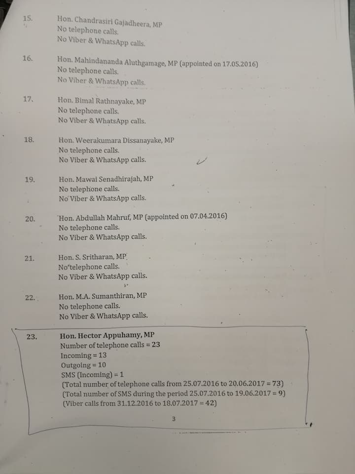 හෙක්ටර් අප්පුහාමි මන්ත්රීවරයා සහ අර්ජුන් ඇලෝසියස් අතර viber කෝල් 42ක් හුවමාරු කරගෙන ඇත. එමෙන්ම ඔවුන් දෙදෙනා අතර 2016.07.25 දින සිට 2017.06.20 කාලය තුළ දුරකථන ඇමතුම් 73ක් ලබාදෙන ඇත. එමෙන්ම 2016.07.25 දින සිට 2017.06.19 කාලය තුළ කෙටි පනිවිඩ 09ක් හුවමාරු වී තිබේ.