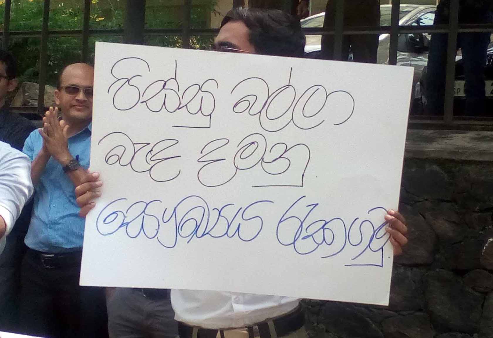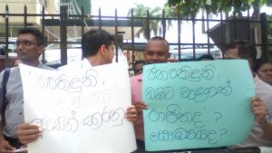 රාජිතගෙන් සෞඛ්ය බේරාගමු, ජනාධිපතිතුමනි රාජිතගේ වියරු තක්කඩිකම් නිම කරණු, ජනපතිතුමනි ඔබවට වැදගත් රාජිත සෞඛ්යයද? ආදි සටන් පාඨ ලියු පොස්ටර් ප්රදර්ශනය කරමින් වෛද්යවරු විරෝධතාවයේ නිරතවුහ.