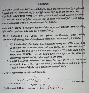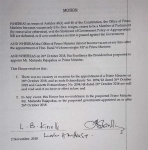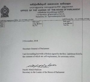 සභානායක ලක්ෂ්මන් කිරිඇල්ල මහතාගේ අත්සනින් යුතුව බාර දුන් විශ්වාභංග යෝජනාවේ මෙසේ ද සඳහන් වෙයි.