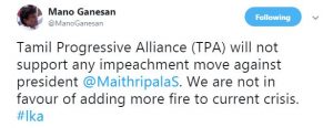 ජනාධිපති මෛත්රිපාල සිරිසේන මහතාට එරෙහිව දෝෂාභියෝගයක් ගෙන එනු ලැබුවහොත් එයට සහය පළ නොකිරීමට තම පක්ෂය තීරණය කර ඇති බව ද්රවිඩ ප්රගතිශීලි සන්ධානය ප්රකාශ කරනවා.