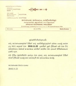 2018.11.20 දින මෙම ලිපිය නිකුත් කර ඇති බව ද වාර්තා වෙයි.