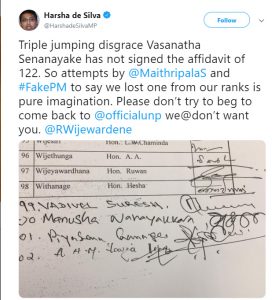 කෙසේ වෙතත් තමන්ට තවමත් 122ක බහුතරයක් ඇති බවත් ඔහු සිය ට්විටර් ගිණුමට අදහස් දක්වමින් සඳහන් කරයි.