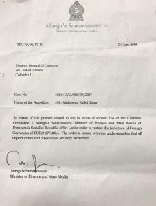 විදේශ මුදල් වශයෙන් යුරෝ 177,000ක නොට්ටු අතැතිව රේගුව විසින් අත්අඩංගුවට ගනු ලැබූ ව්යාපාරිකයකු වන මොහොමඩ් කබොල් ටබාර් නැමැත්තා ට නිදහස්කොට එම මුදල් ආපසු ලබාදෙන ලෙස නියෝග කරමින් රේගු අධ්යක්ෂක ජෙනරාල්ට ලිපියක් යැවීම පිළිබඳව හිටපු මුදල් ඇමති මංගල සමරවීර මහතාට චෝදනා එල්ල වේ.