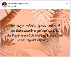 ජන බලය සහිත සජිත් ප්රේමදාස මහතාට ඉදිරි මහමැතිවරණයේදී අගමැති අපේක්ෂක ධුරය ලබා නොදී එය ගාමිණි ජයවික්රම මහතාට ලබාදීමට රනිල් වික්රමසිංහ පාර්ශ්වය ගෙන ඇති තීරණයට දැඩි විරෝධය දක්වමින් සජිත් ප්රේමදාස මහතාගේ මාධ්ය ලේකම් මහිලාල් එම්. සෙනවිරත්න මහතා සිය ෆේස්බුක් ගිණුමෙහි සටහන් තබා ඇත්තේ පහත පරිදිය.