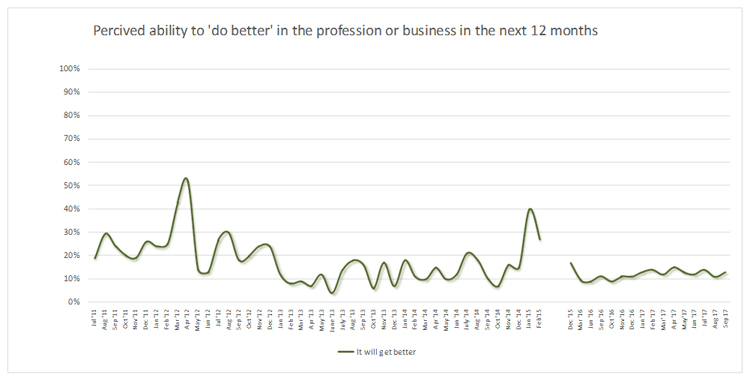 ආර්ථික අපේක්ෂාව පිළිබඳ 2017 සැප්තැම්බර් මාසයේ දත්ත විමසා බැලීමේදී පෙනී යන්නේ ඉදිරි මාස 12 සැලකිල්ලට ගත්කළ තම රැකියාවේ තත්ත්වය හෝ ව්යාපාරය වැඩි දියුණු කර ගැනීම කෙරෙහි ජනතාවගේ අපේක්ෂාව පසුගිය අගෝස්තු මාසයට සාපේක්ෂව ඉහළ ගොස් තිබෙන බවයි. මෙම අපේක්ෂාව පසුගිය අගෝස්තු මාසයේදී පහළ ගොස් තිබුණි.