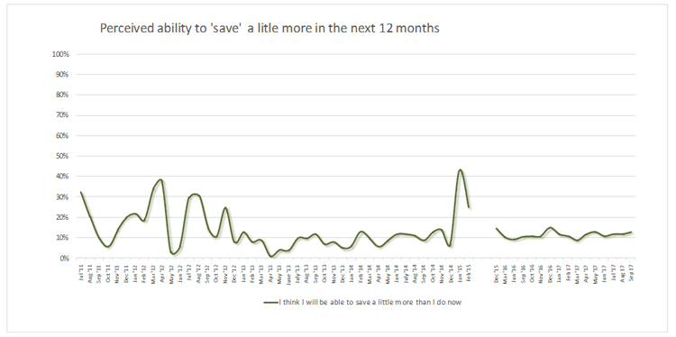 ඉදිරි මාස 12 ඇතුළත උපයන මුදලින් යම් කිසි ප්රමාණයක් ඉතිරි කිරීමට තිබෙන හැකියාව පිළිබඳව තිබෙන අපේක්ෂාවද 2017 අගෝස්තු මාසයට සාපේක්ෂව 2017 සැප්තැම්බර් මාසයේදී වර්ධනය වී තිබේ. ආයෝජක විශ්වාසය වර්ධනය වීම ඇතුළු කාරණා මේ සඳහා බලපාන්නට ඇත.
