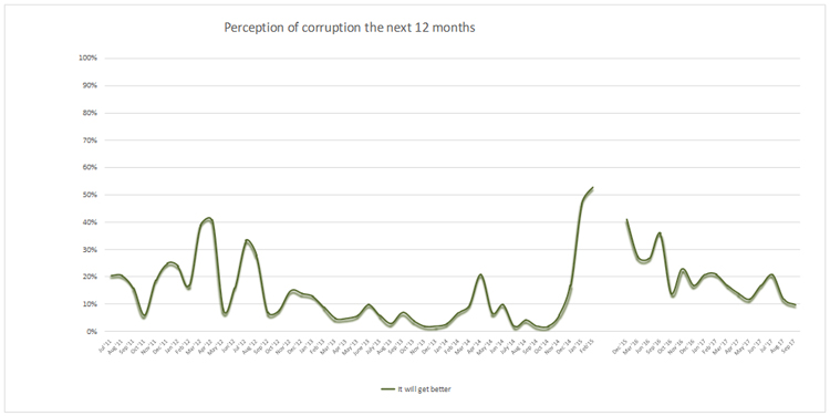 මෙරට දූෂණය අඩුවීමේ බලාපොරොත්තු පසුගිය අගෝස්තු මාසයේදී කැපී පෙනෙන ලෙස පහළ ගිය අතර එය නැවතත් 2017 සැප්තැම්බර් මාසයේදීත් පහළ ගොස් ඇත. විවිධ අක්රමිකතාවයන්ට එරෙහිව චෝදනා ලැබ තිබෙන දේශපාලනඥයින්ට මෙන්ම දේශපාලන බලය සහිත පුද්ගලයින්ට එරෙහිව කටයුතු කරනු ඇතැයි සමාජය තුළ තිබෙන බලාපොරොත්තුව මේ වනවිට විශාල ලෙස අඩුවී තිබෙන අතර ඔවුන් සිතන්නේ මෙවැනි පුද්ගලයින්ට එරෙහිව කටයුතු කිරිම බළධාරීන් සිතාමතාම පැහැර හරින බවයි.