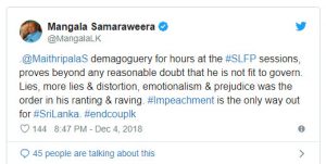 තම ට්විටර් ගිණුම ඔස්සේ සටහනක්මේ තබමින් මන්ත්රීවරයා මේ බව සදහන් කරයි.