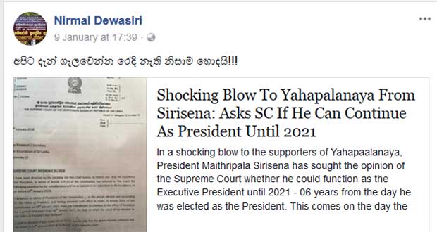 ජනාධිපති මෛත්රීපාල සිරිසේන මහතා සිය නිළ කාලය අවසන් වන්නේ 2020දී ද, 2021 දී ද යන්න ශ්රේෂ්ඨාධිකරණයේ මතය විමසීම සම්බන්ධයෙන්, විශ්ව විද්යාල ආචාර්යවරුන්ගේ සංගමයේ හිටපු සභාපති සහ, වත්මන් යහපාලන රජය බලයට ගෙන ඒම සදහා සුවිශේෂී කාර්යයක නියැළුණු ආචාර්ය නිර්මාල් රංජිත් දේවසිරි මහතා පුවත් අඩවියක යොමුවක්ද සමගින් සිය ෆෙස්බුක් ගිණුමේ තබා තිබුණේ මෙවැනි සටහනකි.