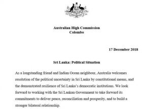 මේ අතර, ශ්රී ලංකාවේ ඔස්ට්රේලියානු මහ කොමසාරිස් කාර්යාලය නිවේදනයක් නිකුත් කරමින් පවසා ඇත්තේ, ශ්රී ලංකාවේ පැවති දේශපාලනික අස්ථාවරභාවයට විසඳුමක් ලැබීම පිළිබඳව සතුටට පත් වන බවය.
