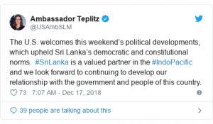 ශ්රී ලංකාවේ ඇමෙරකානු තානාපතිනි ඇලයිනා ටෙප්ලිට්ස් ට්විටර් ඔස්සේ පවසා ඇත්තේ, ශ්රී ලංකාවේ ප්රජාතන්ත්රවාදී සහ ව්යවස්ථාමය සම්මුතීන් ආරක්ෂා කරමින් සති අන්තයේ සිදුවූ දේශපාලනික වෙනස සම්බන්ධයෙන් ඇමෙරිකාව ප්රසාදය පළ කරන බවය.