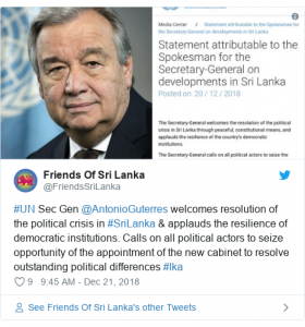 ශ්රී ලංකාවේ බ්රිතාන්ය මහ කොමසාරිස් ජේම්ස් ඩවුරිස් ට්විටර් පණිවුඩයක් නිකුත් කරමින් ශ්රී ලංකාවේ ප්රජාතන්ත්රවාදී ප්රවේශය සම්බන්ධයෙන් ප්රසාදය පළ කර තිබේ.