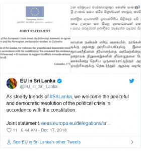 ශ්රී ලංකාවේ යුරෝපා සංගම් කාර්යාලය නිකුත් කළ නිවේදනයක දැක්වෙන්නේ, උද්ගත වූ දේශපාලන අර්බුදයට ව්යවස්ථානුකූල මෙන් ම සාමකාමී සහ ප්රජාතන්ත්රවාදී විසඳුමක් ලබා දීම අගය කරන බවය.