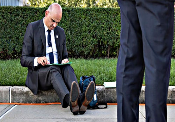 ඇමරිකාවේ නිව්යෝර්ක් නුවර එක්සත් ජාතීන්ගේ මූලස්ථානය පිටත පදික වේදිකාවේ වාඩිවී තම සටහන් ගැන නිරීක්ෂණය කරන මේ පුද්ගලයා ස්විස් ජනාධිපති ඇලන් බර්සට්ය.