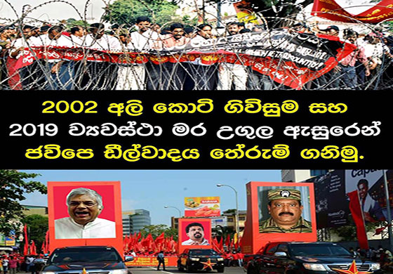 එහෙත් ඉතිහාසයේ මහා සරදමකට මෙන් අද මේ කතාවල හොඳම ප්රචාරකයා වී ඇත්තේ වත්මන් ජනතා විමුක්ති පෙරමුණය. එදා රනිල්ගේ අලි කොටි ගිවිසුම කල් තියා හෙළි කළ ජනතා විමුක්ති පෙරමුණ අද රනිල්ගේ ජාතිවාදී ව්යවස්තාවේ හොඳම ආරක්ෂකයා බවට පත්ව ඇත්තේ කෙසේදැයි ඔබම සිතා බලන්න.