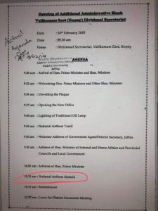 වැඩ සටහනට අනුව දෙමළ භාෂාවෙන් ජාතික ගීය ගායනා කිරීමට පෙරවරු 09-45 ද සිංහල භාෂාවෙන් ජාතික ගීය ගායනා කිරීමට පෙරවරු 10-12 ද වෙන් කොට තිබුණි.