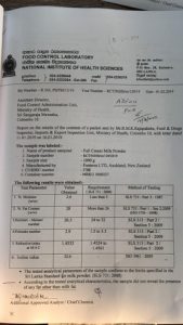 එම වාර්තාවේ අවසන් වගන්තිය මගින් කියවන්නේ අදාළ පරීක්ෂණ අනුව කිරි පිටි වල කිරි මේදය හැර වෙනත් මේදය අඩංගු නොවන බව තහවුරු වන බවය.