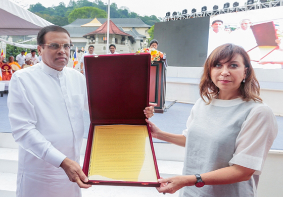 උතුම් වූ සද්ධර්ම කෝෂ්ඨාගාරය වන ත්රිපිටකය ලෝක උරුමයක් ලෙස නම් කිරීමේ යෝජනාව, අතිපූජනීය ත්රෛනිකායික මහා සංඝරත්නයේ ආශිර්වාද මධ්යයේ එක්සත් ජාතින්ගේ සංවිධානයේ නියෝජිතවරිය වෙත භාරදීමේ භාග්යවත් අවස්ථාව අද (23) පස්වරුවේ මහනුවර ඓතිහාසික ශ්රී දළදා මාලිගාවේ මහමළුවේ දී සිදු විය.