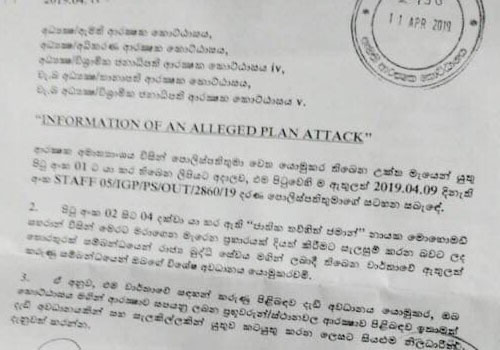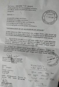 පොලිස්පතිතුමා වෙත යොමුකර තිබෙන ලිපියකින් සඳහන් කර ඇත්තේ ‘‘ජාතික තවුහිත් ජමාත්“ නායක mohomed zaharan විසින් මෙරට මරාගෙන මැරෙන ප්රහාරයක් දියත් කිරීමට සැලසුම් කරන බවට ලද තොරතුරු සම්බන්ධයෙන් රාජ්ය බුද්ධි සේවය මගින් ලබාදී තිබෙන වාර්තාවේ ඇතුළත් කරුණු සම්බන්ධයෙන් පොලිස්පති තුමාගේ විශේෂ අවධානය යොමු කරන්න යැයි ඉල්ලීම් කරමිණි.