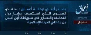 සංචාරක හෝටල් සහ කතෝලික පල්ලි ඇතුළු ස්ථාන 08කදී බෝම්ප පුපුරුවා හරිමින් පුද්ගලයන් 300කට අධික පිරිසකට මරු කැඳවමින් සහ 500කට වැඩි පිරිසකට තුවාල සිදු කරමින් එල්ල කළ ම්ලේච්චර ප්රහාරයේ වගකීම අන්තවාදී අයි.එස්.අයි.එස් ත්රස්ත සංවිධානය විසින් බාරගෙන තිබේ.