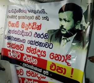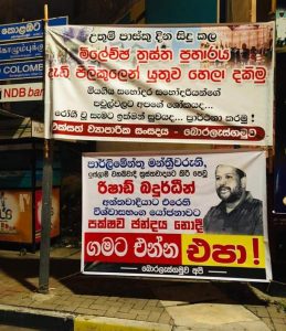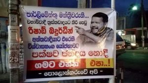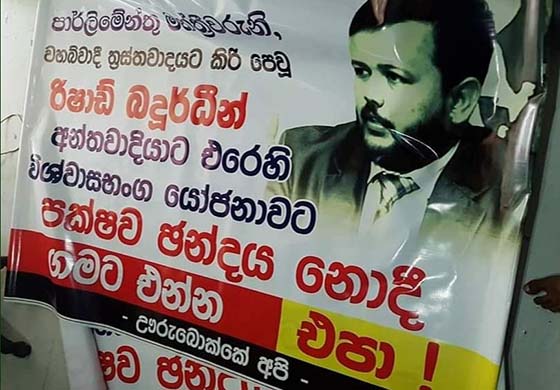 පාස්කු ඉරිදා මරාගෙන මැරෙන බෝම්බ ප්රහාරය සහ මෙරට වහාබ්වාදය ප්රචලිත කිරිමට චෝදනාවට ලක්ව සිටින අමාත්ය රිෂාඩ් බදියුදීන්ට එරෙහිව පාර්ලිමේන්තුවට ඉදිරිපත් කර ඇති විශ්වසභංග යෝජනාවට පක්ෂව ඡන්දය නොදී සිය මැතිවරණ බල ප්රදේශවලට නොඑන්නැයි පාර්ලිමේන්තු මන්ත්රීවරුන්ට අනතුරු අගවන පුවරු රට පුරා නගර ගණනාවක ප්රදර්ශනය කර ඇත.