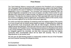 පූජ්ය ගලගොඩ අත්තේ ඥානසාර හිමියන්ට ජනපති සමාව ලබාදීමට ගත් තීරණයට ද්රවිඩ ජාතික සන්ධානය විරෝධය දක්වා තිබේ. එහි මාධ්ය ප්රකාශක පාර්ලිමේන්තු මන්ත්රී එම්.ඒ. සුමන්තිරන් මහතා නිවේදනයක් නිකුත් කරමින් පවසන්නේ ඥානසාර හිමියන්ට ජනපති සමාව දීමට ගත් තීරණය හරහා වැරදි පණිවිඩියක් රටට ලබාදී ඇති බවයි.