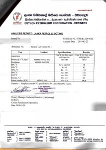 ඒ අනුව පාරිභෝගික අධිකාරිය විසින් IOC සමාගම විසින් අලෙවි කරනු ලබන පෙට්රල් වර්ග කිහිපයක නියදි ලංකා ඛණිජතෙල් නීතිගත සංස්ථාවේ පිරිපහදුවේ පිහිටා ඇති රසායනාගාරය වෙත ලබා දී ඇති ඇති අතර 2019/03/23 දින එම නියදි පරීක්ෂා කර ඇත.