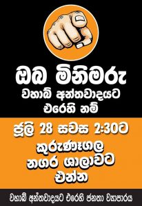 වහාබ් අන්තවාදයට එරෙහි ජනතා ව්යාපාරය විසින් පවත්වනු ලබන ජන රැලි මාලාවේ දෙවන ජන රැලිය හෙට (28) සවස 2:30ට කුරුණෑගල නව නගර ශාලාවේදී පැවැත්වීමට නියමිත බව එහි කැදවුම්කරු මහාචාර්ය පූජ්ය ඉදුරාගාරේ ධම්මරතන හිමියෝ පවසති.