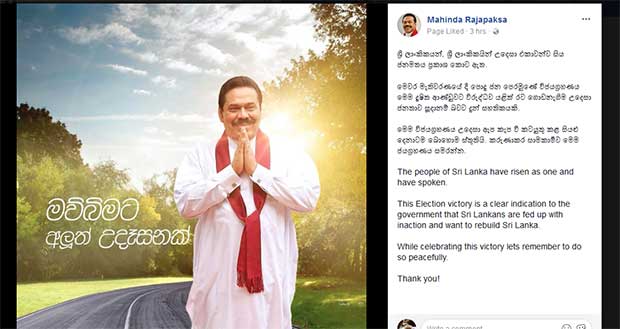 ශ්රී ලංකා පොදුජන පෙරමුණ විසින් වාර්තා කරමින් සිටින දැවැන්ත ජයග්රහණයත් සමග හිටපු ජනාධිපති මහින්ද රාජපක්ෂ මහතා විසින් සිය නිල ෆේස්බුක් ගිණුමට සටහනක් එක් කර ඇත.