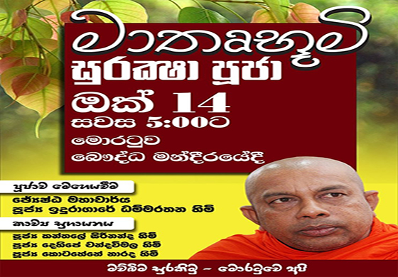 මව්බිම සුරකිමු – මොරටුවේ අපි සංවිධානය විසින් ජනාධිපති අපේක්ෂක ගෝඨාභය රාජපක්ෂ මහතාටත් , රටටත් සෙත්පතා සිදුකරන ”මාතෘභූමි සුරක්ෂ පූජා” වැඩසටහන අද 14 සවස 5.00ට මොරටුව බෞද්ධ මන්දිරයේදී මේ මොහොතේ පැවැත්වේ.