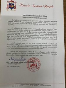 මේ අතර ජනාධිපතිවරණයට පෙර මෙම ගිවිසුම අත්සන් කරන බවට අගමැති රනිල් වක්රමසිංහ මහතා විසින් කළ ප්රකාශයත් සමග අති උතුම් කාදිනල් මැල්කම් රංජිත් පියතුමන් නිවේදනයක් නිකුත් කර නිමින් සදහන්කර ඇත්තේ රටට අහිතකර මෙවැනි ගිවිසුමක් අත්සන් කරන්නේනම් රටේ සමස්ත පොදු මහජනයා ජනතාවගේ අනුමැතියද අවශ්ය බවය.