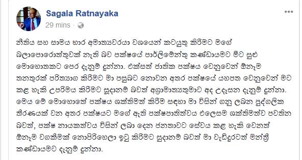 තමන් තව දුරටත් නීතිය හා සාමය ඇමති ධුරයේ කටයුතු කිරීමට කැමැත්තක් නැති බව සාගල රත්නායක මහතා සදහන් කරයි.