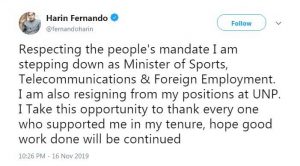 විදුලි සංදේශ, විදේශ රැකියා සහ ක්රීඩා කටයුතු අමාත්ය හරීන් ප්රනාන්දු මහතා සිය අමාත්යධූරයෙන් හා පක්ෂයේ දරණ ලද සියලු තනතුරුවලින් ඉල්ලා අස්වී තිබේ.