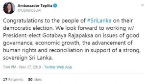 ප්රජාතන්ත්රවාදී ලෙස ජනාධිපතිවරයකු තෝරා පත් කරගත් ශ්රී ලාංකික ජනතාවට සුබ පැතුම් එක් කරන බවත් තේරී පත්වූ ජනාධිපති ගෝඨාභය රාජපක්ෂ මහතා කටයුතු කිරීමට බලාපොරොත්තු වන බවත් ශ්රී ලංකාවේ ඇමෙරිකානු තානාපති ඇලෙයිනා බී. ටෙප්ලිට්ස් මහත්මිය ප්රකාශ කරයි.