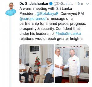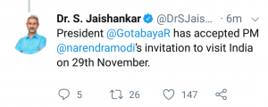 එම අවස්ථාවේදි ඉන්දිය අගමැතිවරයාගේ ආරාධනාව පිලිගනිමින් තමන් නොවැම්බර් 29 වෙනිදා ඉන්දියාවට පැමිණෙන බවට ජනාධිපති ගෝඨාභය රාජපක්ෂ මහතා දැනුම් දුන් බවයි ඉන්දීය විදේශ කටයුතු අමාත්යවරයා ට්විටර් පණිවිඩයක් නිකුත් කරමින් ප්රකාශ කර ඇත්තේ.