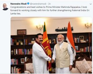 ඉන්දියාව සහ ශ්රී ලංකා අතර සබඳතා තවදුරටත් ශක්තිමත් කිරීම සඳහා නව අග්රාමාත්ය මහින්ද රාජපක්ෂ මහතා සමඟ සමීපව කටයුතු කිරීමට ඉන්දීය අග්රාමාත්යවරයා බලාපොරොත්තු වන බව සිය ටිවිටර් ගිණුමේ වැඩිදුරටත් සඳහන් කර තිබේ.