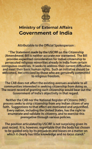මේ අතර අඟහරුවාදා (10 ) ඉන්දියාවේ විදේශ කටයුතු අමාත්යාංශය නිවේදනයක් නිකුත් කරමින් පවසා සිටියේ “ජාත්යන්තර ආගමික නිදහස සඳහා වූ අමෙරිකානු කොමිසම (US Commission on International Religious Freedom – USCIRF )” ඉන්දියාව ලෝක් සභාව සම්මත කළ පුරවැසිභාවය ප්රදානය කිරීමේ (සංශෝදන ) පනත පිළිබඳ ඉදිරිපත් කළ විවේචන වගකීම් සහගත නැතුවා පමණක් නොවෙයි ඒවා නිවැරදිත් නැහැ.” යනුවෙනි.