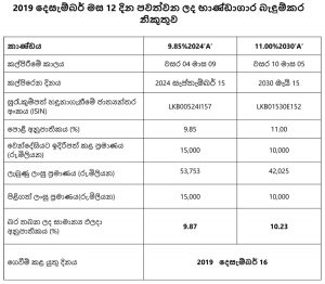 ඊයේ (12) දින පවත්වන ලද භාණ්ඩාගාර බැඳුම්කර වෙන්දේසියේ දී රුපියල් මිලියන 25,000 ක බැඳුම්කර නිකුත් කිරීමට ශ්රී ලංකා මහ බැංකුවේ රාජ්ය ණය දෙපාර්තමේන්තුව පියවර ගෙන තිබේ.
