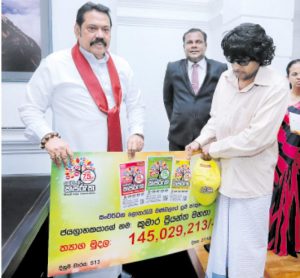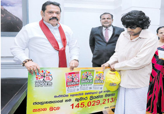 සංවර්ධන ලොතරැයි ඉතිහාසයේ දැවැන්තම ජයමල්ල වූ රුපියල් කෝටි දහහතරහමාරක මුදල රත්නපුර මලංගම ප්රදේශයේ කුමාර ප්රියන්තට හිමිවී තිබේ. මෙම ත්යාග මුදල හිමිවී ඇත්තේ ‘කෝටිපති කප්රුක’ ලොතරැයිපතටය. ත්යාගය පිළිබඳ චෙක්පත අග්රාමාත්ය මහින්ද රාජපක්ෂ මහතාගේ සුරතින් පෙරේදා (18 වැනිදා) අරලියගහ මන්දිරයේදී ප්රදානය කෙරිණි.