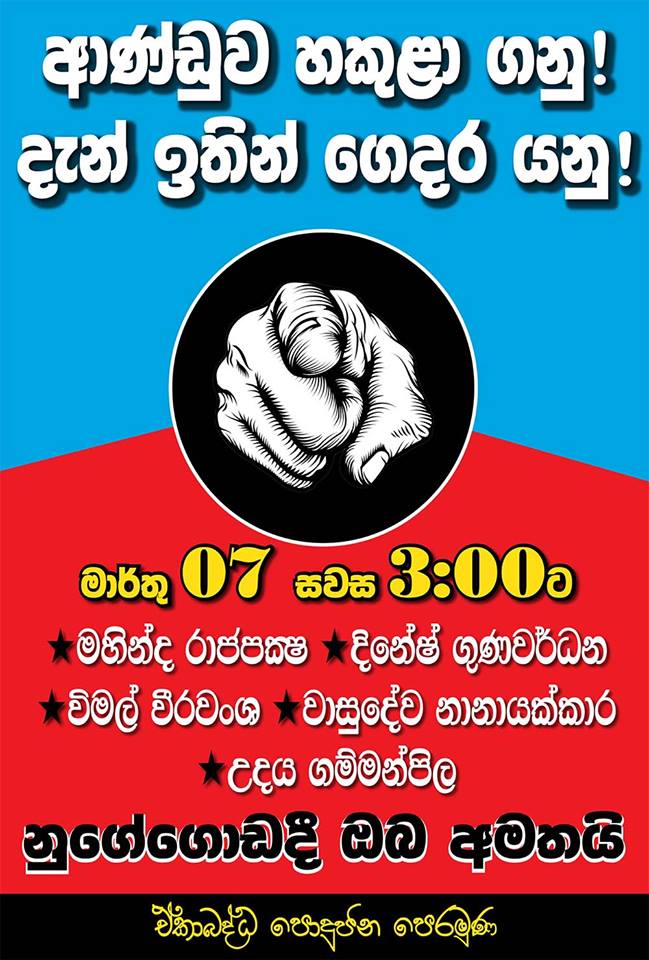 ආණ්ඩුව හකුළා ගනු! දැන් ඉතින් ගෙදර යනු! තේමාව කරගත් ඒකාබද්ධ පොදුජන පෙරමුණ විසින් පාර්ලිමේන්තු මැතිවරණය පවත්වන ලෙස රජයට බලකරමින් පවත්වන ජන රැලි මාලාවේ පළමු රැලිය 2018 මාර්තු 07 වන දින සවස 3:00ට මහින්ද රාජපක්ෂ, දිනේෂ් ගුණවර්ධන, විමල් වීරවංශ , වාසුදේව නානායක්කාර, උදය ගම්මන්පිල ඇතුලු නායකයින් ගේ ප්රධානත්වයෙන් නුගේගොඩ දී පැවැත්වේ.