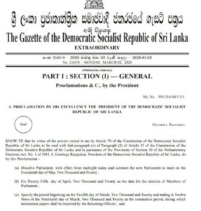පාර්ලිමේන්තුව විසුරුවාහැරිමේ ගැසට් නිවේදනය මේ වන විට රජයේ මුද්රණ දෙපාර්තමේන්තුව විසින් නිකුත් කර තිබේ. ඒ අනුව අද මධ්යම රාත්රියේ සිට පාර්ලිමේන්තුව විසුරුහැරෙනු ඇත.
