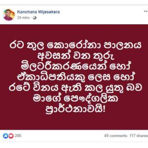 රට තුළ කොරෝනා වසංගත තත්වය පාලනය කර අවසන් වෙනතුරු මිලිටරිකරණයෙන් හෝ ඒකාධිපතියකු ලෙසින් හෝ රටේ විනය ඇති කළ යුතු බව හිටපු රාජ්ය අමාත්ය කාංචන විජේසේකර මහතා පවසයි.
