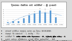 ඒ අනුව මාර්තු 16 දින 10, මාර්තු 17 දින 13 ,මාර්තු 18 දින 11 සහ මාර්තු 19 දින 13 ක් වූ ලෙස වාර්තා වූ නව රෝගීන් ගණන ඊයේ(20) දිනයේදී නව රෝගීන් 6 ක් බවට පත් වී ඇති බව  සෞඛ්‍ය අමාත්‍යංශයේ වසංගත රෝග විද්‍යා අංශය විසින් නිකුත් කරන ලද නවතම වාර්තාවේ දැක්වෙයි. රෝගය පාලනය සම්බන්ධයෙන් මහජනයා මීට වඩා වගකීම් සහගතව හැසිරෙන්නේ නම් COVID-19 වෛරස් වසංගතය ශ්‍රී ලංකාව තුළ ඉක්මනින් පාලනය කරගත හැකි බව වසංගත රෝග මර්ධන විශේෂඥයන්ගේ මතයයි.
