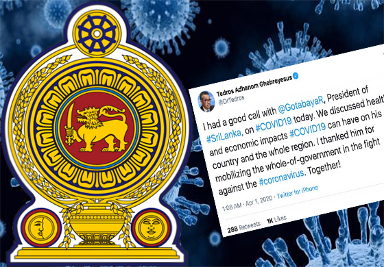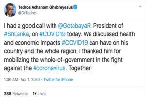 ලෝක සෞඛ්ය සංවිධානයේ අධ්යක්ෂ ජෙනරාල් ටෙඩ්රෝස් ගෙබ්රියේසස් මහතාගේ ටිව්ටර් සටහනට ප්රතිචාර දැක්වූ ජනාධිපති ගෝඨාභය රාජපක්ෂ මහතා වෛරස ව්යාප්තිය පාලනය සඳහා ලෝක සෞඛ්ය සංවිධානය විසින් දක්වන සහයෝගයට සිය ස්තූතිය පළ කර තිබුණි.