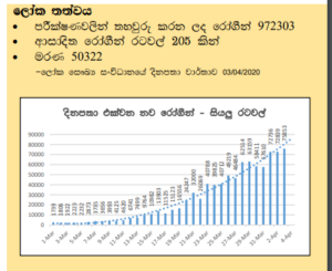 ඊයේ වන විට ලෝකයේ රටවල් 205කින් වෛරසය ආසාදනය වූවන් 972303 දෙනෙකු හමුවී ඇති අතර ලෝකය පුරා මරණ 50322ක් වාර්තා වී තිබේ. වැඩිම ආසාදිතයන් ප්රමාණයක් ඊයේ දිනය තුළ වාර්තා වූ රට ලෙස ලෝක සෞඛ්යය සංවිධානයේ වාර්තා වලට එක් වන්නේ අමෙරිකා එක්සත් ජනපදය වන අතර එම අගය 26298කි.